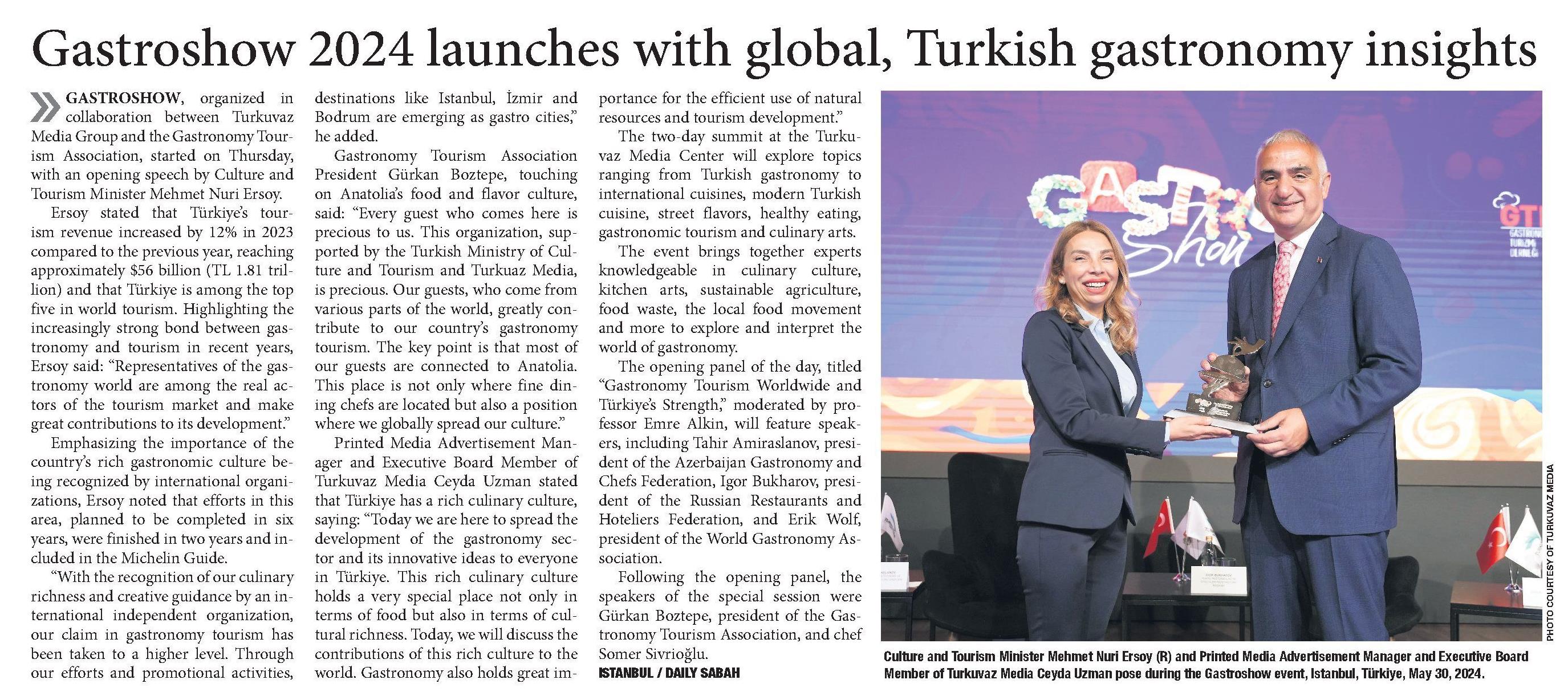 Gastroshow 2024 launches with global insights Vi GASTROSHOW, organized in mm collaboration between Turkuvaz Media Group and the Gastronomy Tourism Association, started yesterday, with an opening speech by Culture and Tourism Minister Mehmet Nuri Ersoy. Ersoy stated that Türkiye's tourism revenue increased by 12% in 2023 compared to the previous year, reaching approximately $56 billion (TL 1. 81 trillion) and that Türkiye is among the top five in world tourism. Highlighting the increasingly strong bond between gastronomy and tourism in recent years, Ersoy said: "Representatives of the gastronomy world are among the real actors of the tourism market and make great contributions to its development. " Emphasizing the importance of the country's rich gastronomic culture being recognized by international organizations, Ersoy noted that efforts in this area, planned to be completed in six years, were finished in two years and included in the Michelin Guide. "With the recognition of our culinary richness and creative guidance by an international independent organization, our claim in gastronomy tourism has been taken to a higher level. PAGE 6 Gastroshow 2024 launches with global, Turkish gastronomy insights GASTROSHOW, organized in mm collaboration between Turkuvaz Media Group and the Gastronomy Tourism Association, started on Thursday, with an opening speech by Culture and Tourism Minister Mehmet Nuri Ersoy. Ersoy stated that Türkiye's tourism revenue increased by 12% in 2023 compared to the previous year, reaching approximately $56 billion (TL 1. 81 trillion) and that Türkiye is among the top five in world tourism. Highlighting the increasingly strong bond between gastronomy and tourism in recent years, Ersoy said: "Representatives of the gastronomy world are among the real actors of the tourism market and make great contributions to its development. " Emphasizing the importance of the country's rich gastronomic culture being recognized by international organizations, Ersoy noted that efforts in this area, planned to be completed in six years, were finished in two years and included in the Michelin Guide. "With the recognition of our culinary richness and creative guidance by an international independent organization, our claim in gastronomy tourism has been taken to a higher level. Through our efforts and promotional activities, destinations like istanbul, İzmir and Bodrum are emerging as gastro cities, " he added. Gastronomy Tourism Association President Gürkan Boztepe, touching on Anatolia's food and flavor culture, said: "Every guest who comes here is precious to us. This organization, supported by the Turkish Ministry of Culture and Tourism and Turkuaz Media, is precious. Our guests, who come from various parts of the world, greatly contribute to our country's gastronomy tourism. The key point is that most of our guests are connected to Anatolia. This place is not only where fine dining chefs are located but also a position where we globally spread our culture. " Printed Media Advertisement Manager and Executive Board Member of Turkuvaz Media Ceyda Uzman stated that Türkiye has a rich culinary culture, saying: "Today we are here to spread the development of the gastronomy sector and its innovative ideas to everyone in Türkiye. This rich culinary culture holds a very special place not only in terms of food but also in terms of cultural richness. Today, we will discuss the contributions of this rich culture to the world. Gastronomy also holds great importance for the efficient use of natural resources and tourism development. " The two-day summit at the Turkuvaz Media Center will explore topics ranging from Turkish gastronomy to international cuisines, modern Turkish cuisine, street flavors, healthy eating, gastronomic tourism and culinary arts. The event brings together experts knowledgeable in culinary culture, kitchen arts, sustainable agriculture, food waste, the local food movement and more to explore and interpret the world of gastronomy. The opening panel of the day, titled "Gastronomy Tourism Worldwide and Türkiye's Strength, " moderated by professor Emre Alkin, will feature speakers, including Tahir Amiraslanov, president of the Azerbaijan Gastronomy and Chefs Federation, Igor Bukharov, president of the Russian Restaurants and Hoteliers Federation, and Erik Wolf, president of the World Gastronomy Association. Following the opening panel, the speakers of the special session were Gürkan Boztepe, president of the Gastronomy Tourism Association, and chef Somer Sivrioğlu. İSTANBUL/DAILY SABAH Culture and Tourism Minister Mehmet Nuri Ersoy (R) and Printed Media Advertisement Manager and Executive Board Member of Turkuvaz Media Ceyda Uzman pose during the Gastroshovv event, İstanbul, Türkiye, May 30, 2024. Gastroshow 2024 launches with global, Turkish gastronomy insights GASTROSHOW, organized destinations like istanbul, İzmir and portance for the efficient use of natural mm collaboration between Turkuvaz Bodrum are emerging as gastro resources and tourism development. " Media Group and the Gastronomy Tour- ism Association, started on Thursday, Gastronomy Tourism Association vaz Media Center will explore topics with an opening speech by Culture and President Gürkan Boztepe, touching ranging from Turkish gastronomy to ^ Tourism Minister Mehmet Nuri Ersoy. on Anatolia's food and flavor culture, international cuisines, modern Turkish Jthr' ' Ersoy stated that Türkiye's tour- said: "Every guest who comes here is cuisine, street flavors, healthy eating, \__Wğ ^ Trtl ism revenue increased by 12% in 2023 precious to us. This organization, sup- gastronomic tourism and culinary arts. , compared to the previous year, reaching ported by the Turkish Ministry of Cul- The event brings together experts ^ o% approximately $56 billion (TL 1. 81 tril- ture and Tourism and Turkuaz Media, knowledgeable in culinary culture, jm- ^ ^ v lion) and that Türkiye is among the top is precious. Our g