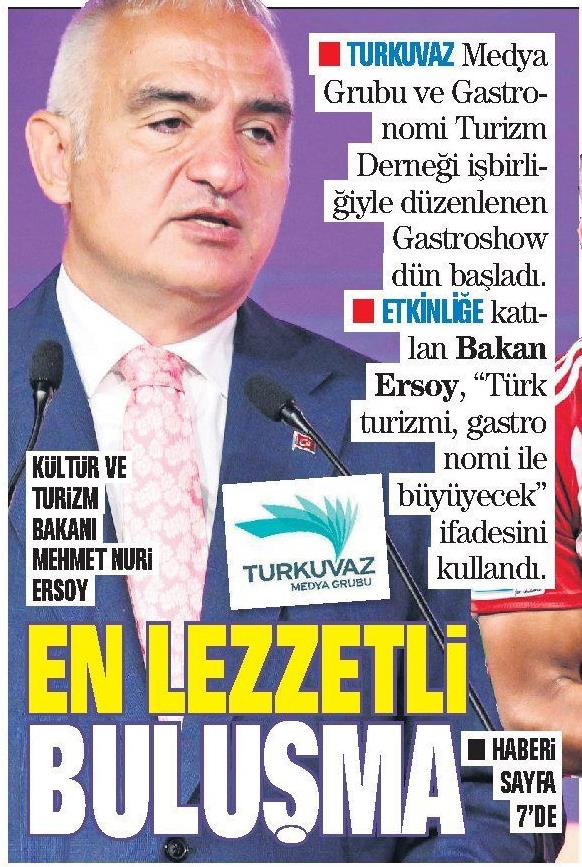 V YlTlJRlâmZMe^l H - MnjGrubuveGastro-1 nomi Turizm I Demeği işbirli-1' ^^^^e düzenlenen I ¦ Gastroshow ¦ dün başladı. I B katı-1 lan Bakan ^ TURİZM t ^ ^^^^^büyüyecek" \ BAKANI | _ 1 |H ifadesini W MEHMETHJIRi I TUrkuvaz 9|kullandı, m ERSDY H I MfOYACRUBU I TURKUVAZ Medya Grubu ve Gastronomi Turizm Demeği işbirliğiyle düzenlenen Gastroshow dün başladı. ETKİNLİĞE katılan Bakan Ersoy, "Türk turizmi, gastro nomi ile ıbüyüyecek" |H ifadesini irkUVAZ H kullandı. GASIRONOMİ i£ BÜYÜYECEK Turkuvaz Medya Grubu ve Gastronomi Turizm Derneği iş birliğiyle düzenlenen Gastroshovv'un açılışında konuşan Kültür ve Turizm Bakanı Mehmet Nuri Ersoy, ülkemizin turizminin gastronomi ile birlikte büyüyeceğine dikkati çekti. . . TURKUVAZ Medya Grubu ve Gastronomi Turizm Derneği iş birliğiyle düzenlenen Gastroshow başladı. Kültür ve Turizm Bakanı Mehmet Nuri Ersoy, Turkuvaz Medya Merkezi'nde düzenlenen etkinliğin açüışında yaptığı konuşmada, Türkiye'nin dünya turizminde ilk 5 içinde yer aldığını söyledi. Gastronomi ile turizm arasında son yıllarda giderek güçlenen bağa dikkat çeken Bakan Ersoy, "Gastronomi dünyasının temsilcüeri, turizm pazarının gerçek aktarımları arasında yer almakta, turizmin gelişmesine büyük katkılar sağlamaktadır" dedi. 2 YILDA GERÇEK OLDU Bakan Ersoy, turizm hareketlerinde gastronominin belirleyicüiğinin arttığını vurgulayarak, "Bir ülkeye yapılacak seyahatte o ülkenin mutfak kültürünün, yaratıcı mutfak sanatının ne denli etküi olduğu açık bir şekilde görülmektedir. Türkiye olarak çok zengin bir gastronomi geçmişimiz var ama bu zenginliğin uluslararası prestije sahip kurumlarca tescil edilmesi, apayrı bir önem arz ediyor" diye konuştu. Bu hedef doğrultusunda 6 yılda yapılması planlananları 2 yılda tamamladıklarının altını çizen Ersoy, 2022'de İstanbul'un, ardından da İzmir ve Bodrum'un Michelin Rehberi'ne girmesine öncülük ettiklerini aktardı. GELİR BÜYÜYOR İstanbul, İzmir ve Bodrum gibi destinasyonların birer "Gastrocity" olarak öne çıktığının altını çizen Ersoy, "Ülkemizin turizm geliri 2023'te bir önceki yıla göre yüzde 12 artarak yaklaşık 56 milyar dolar oldu. Toplam gelir içerisindeki yemeiçme harcaması ise yüzde 19 artış gösterdi. Ülkemizin mutfak kültürü, gastronomi turizmi açısından büyük avantaj" dedi. |Turkuvaz Medya Yazılı Basın Reklam Genel Müdürü ve İcra Kurulu Üyesi Ceyda Uzman, Bakan Ersoy'a teşekkür plaketi İKİ YÖNLÜ KA1KI SAĞLIYOR ¦ TURKUVAZ Medya Yazılı Basın Reklam Genel Müdürü ve İcra Kurulu Üyesi Ceyda Uzman, ülkemizin zengin bir mutfak kültürüne sahip olduğunu belirterek, "Bugün Türkiye'de gastronomi sektörünün gelişimini ve yenilikçi fikirlerini herkese yaymak için bir aradayız. Bu zengin mutfak kültürü sadece yemekle değil aynı zamanda kültürel zenginlik açısından da son derece özel bir yere sahiptir. Bugün burada bu zengin kültürün dünyaya olan katkılarını konuşacağız. Gastronomi aynı zamanda doğal kaynakların verimli kullanımı ve turizmin geliştirilmesi açısından büyük önem taşıyor" dedi. iUi? MUTFAĞA SAHBİZ ¦ BAKAN Ersoy, Türk mutfağının hem ekolojik hem de kültürel bağlamda sürdürülebilir bir mutfak olduğunu kaydederek, şu bilgileri verdi: "Hiçbir şey gereksiz yere harcanmaz. Türk mutfağı kırsaldan saraya uzanan, ilk başlangıç noktasındaki yaratıcılığını hiçbir zaman kaybetmeden, yeni dokunuşlarla zenginleşen çok kültürlü yapıyla toplumun etnik yapısını da aynı potada birleştiren hoşgörülü bir sentez mutfağıdır. Bu farklılığın ve zenginliğin dünyaya doğru şekilde aktarılması adına, 10 yıldan beri New York'tan Dubai'ye Türkiye'nin gastronomi zenginliğini tanıtan Gastroshow'un gerçekleşmesine katkı sağlayan herkese teşekkürlerimi sunuyorum. " fimrai DEGiSiM OlDU ¦ SON yıllarda turizm trendlerinde büyük bir değişim yaşandığını dile getiren Ersoy, şu değerlendirmeyi yaptı: "Geçmiş dönemlerdeki turizm algısıyla bugünkü turizm anlayışı arasında büyük farklar oluştuğunu görüyoruz. Bu açıdan bizler de uluslararası trendleri çok yakından takip ediyoruz. Dünyada yeni turizm perspektifini en iyi analiz eden ve bu yeni anlayışa uygun bir altyapı geliştirmeye çalışan ülkelerden biri Türkiye'dir. " İLE E »GASTRONOMİ LE BÜYÜYECEK vaz Medya Grubu ve Gastronomi Turizm Derneği iş birliğiyle düzenlenen Dshovv'un açılışında konuşan Kültür ve Turizm Bakanı Mehmet Nuri Ersoy, lizin turizminin gastronomi ile birlikte büyüyeceğine dikkati çekti. . . 'KUVAZ Medya Grubu I , , 7 - Gastronomi Turizm Turkuvaz Medya Yazılı Basın Reklam Genel rneği iş birliğiyle Müdürü ve İcra Kurulu Üyesi Ceyda Uzman^HB^B^^^BTT| 11 ' 11 ?n Gastroshow başladı. Bakan Ersoy'a teşekkür plaketi verdi. ^MÜLÜlİ'i ı l fi I 111' l f 1 Turizm Bakanı ^^^B ¦ BAKAN Ersoy, Türk Juri Ersoy, Turkuvaz r ^^B mutfağının hem ekolojik îrkezi'nde düzenlenen f 9 hem de kültürel bağlamda açüışında yaptığı * y sürdürülebilir bir mutfak la, Türkiye'nin dünya I Tâ ^ L I olduğunu kaydederek, şu e ük 5 içinde yer bilgileri verdi: "Hiçbir şey jyledi. Gastronomi «Er gereksiz yere harcanmaz, arasında son yıllarda ttjl ^ J (UKt' Türk mutfağı kırsaldan üçlenen bağa dikkat f* M v saraya uzanan, Uk $an Ersoy, "Gastronomi r başlangıç noktasındaki n temsilcüeri, turizm . . . 'a yaratıcılığını hiçbir gerçek aktarımları zaman kaybetmeden, rer almakta, turizmin "!/'¦' yeni dokunuşlarla le büyük katküar X, ?-'M zenginleşen çok kültürlü tadır" dedi. y/* r yapıyla toplumun etnik yapısını da aynı potada i GERÇEK OLDU birleştiren hoşgörülü bir Ersoy, turizm sentez mutfağıdır. Bu inde gastronominin farklılığın ve zenginliğin liğinin arttığını r