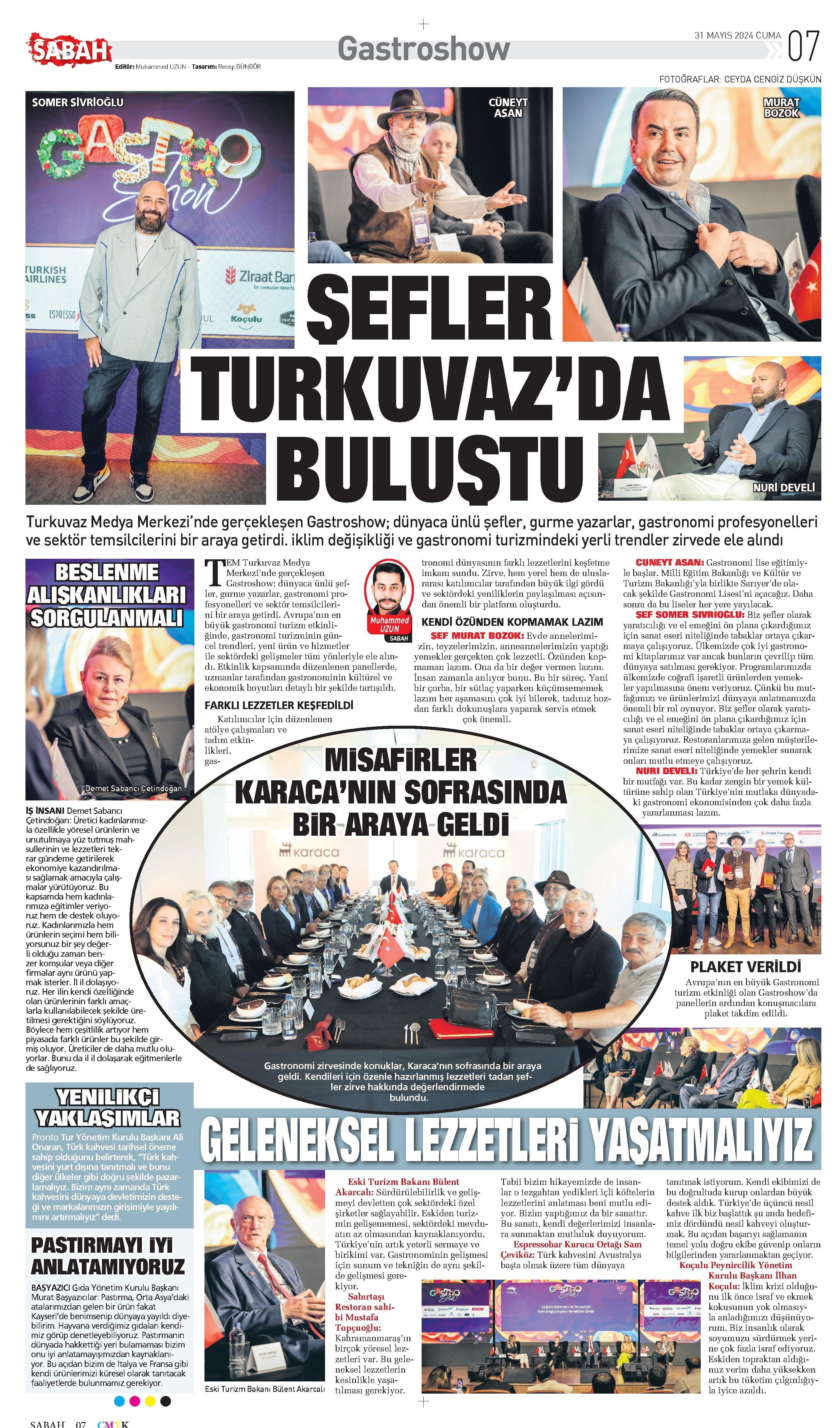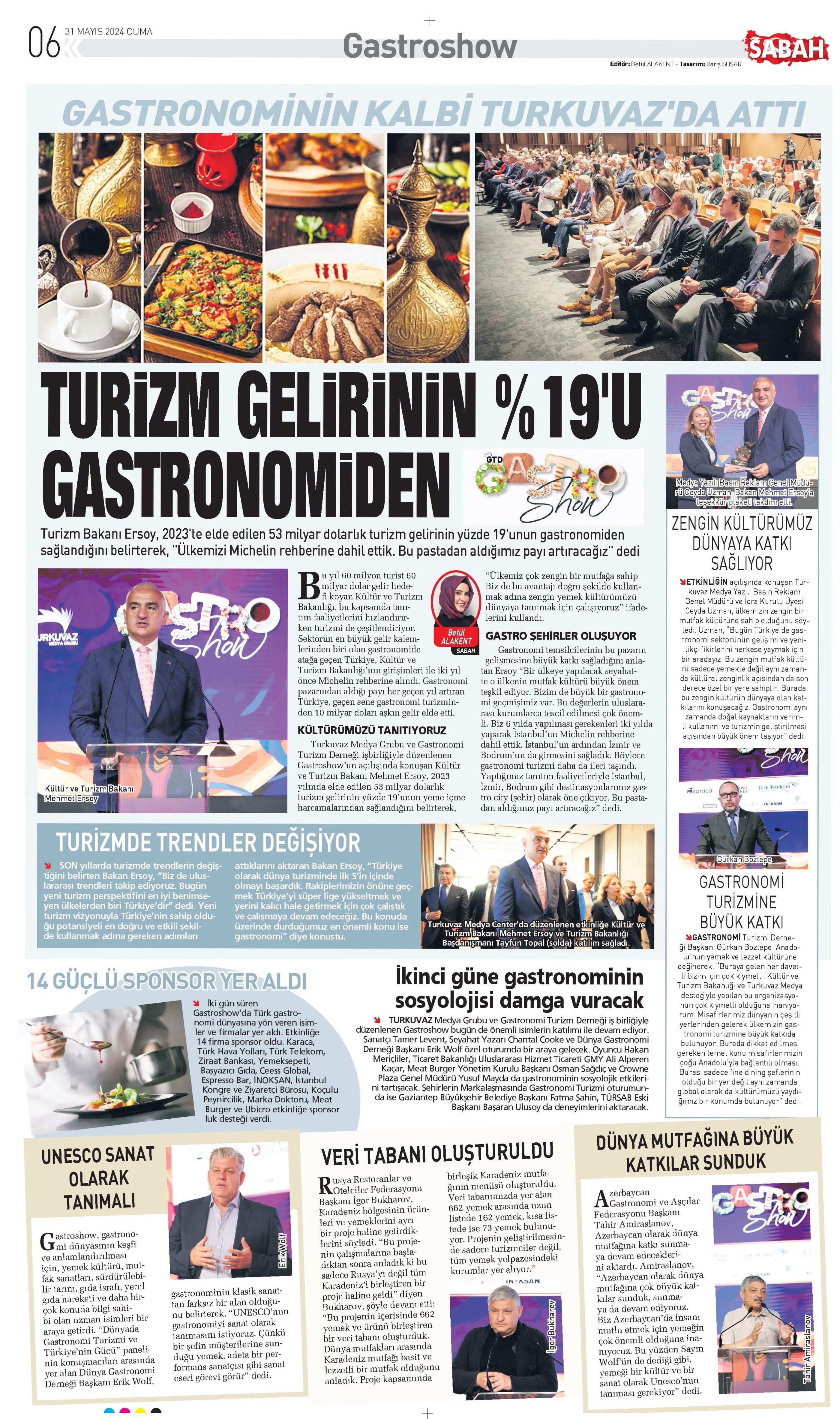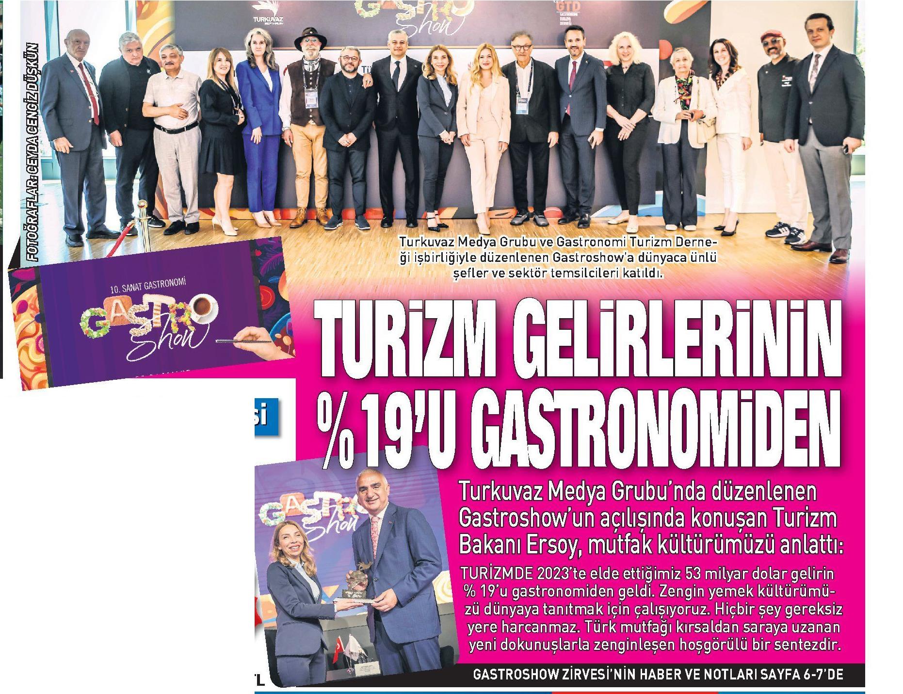 İRİZNTGEURLERİNİN %19'U GASIRONOMIDEN Turkuvaz Medya Grubu'nda düzenlenen Gastroshow'un açılışında konuşan Turizm Bakanı Ersoy, mutfak kültürümüzü anlattı* M TURİZMDE 2023'te elde ettiğimiz 53 milyar dolar gelirin 1 % 19'u gastronomiden geldi. Zengin yemek kültürümüm zü dünyaya tanıtmak için çalışıyoruz. Hiçbir şey gereksiz yere harcanmaz. Türk mutfağı kırsaldan saraya uzanan yeni dokunuşlarla zenginleşen hoşgörülü birsentezdir. GASTROSHOVVZİRVESİ'NİN HABER VE NOTLARI SAYFA 6-7'DE ifİ Turkuvaz Medya Grubu ve Gastronomi Turizm Derne^^ M ği işbirliğiyle düzenlenen Gastroshovv'a dünyaca ünlü «F i iJV ılılri3r 1 11N \\ \m GASTRONOMININ KALBİ TURKUVAZ'DA ATTI 1URDM GEURİNIM % 1 «TU (¦ASTRONOMİDEN Turizm Bakanı Ersoy, 2023'te elde edilen 53 milyar dolarlık turizm gelirinin yüzde 19'unun gastronomiden sağlandığını belirterek, "Ülkemizi Michelin rehberine dahil ettik. Bu pastadan aldığımız payı artıracağız" dedi tâ i>ı»d^9 ^ jSm (mj) Kültür ve TurizmlBa kanı Fi M "e K m e ti E râ'oTSJ T i Bu yıl 60 milyon turist 60 milyar dolar gelir hedefi koyan Kültür ve Turizm Bakanlığı, bu kapsamda tanıtım faaliyetlerini hızlandırırken turizmi de çeşitlendiriyor. Sektörün en büyük gelir kalemlerinden biri olan gastronomide atağa geçen Türkiye, Kültür ve Turizm Bakanlığı'nın girişimleri ile iki yıl önce Michelin rehberine alındı. Gastronomi pazarından aldığı payı her geçen yıl artıran Türkiye, geçen sene gastronomi turizminden 10 milyar doları aşkın gelir elde etti. KÜLTÜRÜMÜZÜ TANITIYORUZ Turkuvaz Medya Grubu ve Gastronomi Turizm Derneği işbirliğiyle düzenlenen Gastroshow'un açılışında konuşan Kültür ve Turizm Bakanı Mehmet Ersoy, 2023 yılında elde edilen 53 milyar dolarlık turizm gelirinin yüzde 19'unun yeme içme harcamalarından sağlandığını belirterek, "Ülkemiz çok zengin bir mutfağa sahip Biz de bu avantajı doğru şekilde kullanmak adına zengin yemek kültürümüzü dünyaya tanıtmak için çalışıyoruz" ifadelerini kullandı. GASTRO ŞEHİRLER OLUŞUYOR Gastronomi temsilcilerinin bu pazarın gelişmesine büyük katkı sağladığını anlatan Ersoy "Bir ülkeye yapılacak seyahatte o ülkenin mutfak kültürü büyük önem teşkil ediyor. Bizim de büyük bir gastronomi geçmişimiz var. Bu değerlerin uluslararası kurumlarca tescil edilmesi çok önemli. Biz 6 yılda yapılması gerekenleri iki yılda yaparak İstanbul'un Michelin rehberine dahil ettik. İstanbul'un ardından İzmir ve Bodrum'un da girmesini sağladık. Böylece gastronomi turizmi daha da ileri taşındı. Yaptığımız tanıtım faaliyetleriyle İstanbul, İzmir, Bodrum gibi destinasyonlarımız gastro city (şehir] olarak öne çıkıyor. Bu pastadan aldığımız payı artıracağız" dedi. TURİZMDE TRENDLER DEĞİŞİYOR D. SON yıllarda turizmde trendlerin değiştiğini belirten Bakan Ersoy, "Biz de uluslararası trendleri takip ediyoruz. Bugün yeni turizm perspektifini en iyi benimseyen ülkelerden biri Türkiye'dir" dedi. Yeni turizm vizyonuyla Türkiye'nin sahip olduğu potansiyeli en doğru ve etkili şekilde kullanmak adına gereken adımları attıklarını aktaran Bakan Ersoy, "Türkiye olarak dünya turizminde ilk 5'in içinde olmayı başardık. Rakiplerimizin önüne geçmek Türkiye'yi süper lige yükseltmek ve yerini kalıcı hale getirmek için çok çalıştık ve çalışmaya devam edeceğiz. Bu konuda üzerinde durduğumuz en önemli konu ise gastronomi" diye konuştu. Turkuvaz Medya Center'da düzenlenen etkinliğe Kültür ve TurizmjBakanı Mehmet Ersoy ve Turizm Bakanlığı A Başdanışmanı Tayfun Topal (solda) katılım sağladı ^ 1UGUCLÜSPONSOR YER ALDI ^ İki gün süren Gastroshovv'da Türk gastronomi dünyasına yön veren isimler ve firmalar yer aldı. Etkinliğe 14 firma sponsor oldu. Karaca, Türk Hava Yolları, Türk Telekom, Ziraat Bankası, Yemeksepeti, Başyazıcı Gıda, Ceess Global, Espresso Bar, (NOKSAN, İstanbul Kongre ve Ziyaretçi Bürosu, Koçulu Peynircilik, Marka Doktoru, Meat Burger ve Ubicro etkinliğe sponsorluk desteği verdi. İkinci güne gastronominin sosyolojisi damga vuracak TURKUVAZ Medya Grubu ve Gastronomi Turizm Derneği iş birliğiyle düzenlenen Gastroshovv bugün de önemli isimlerin katılımı ile devam ediyor. Sanatçı Tamer Levent, Seyahat Yazarı Chantal Cooke ve Dünya Gastronomi Derneği Başkanı Erik Wolf özel oturumda bir araya gelecek. Oyuncu Hakan Meriçliler, Ticaret Bakanlığı Uluslararası Hizmet Ticareti GMY Ali Alperen Kaçar, Meat Burger Yönetim Kurulu Başkanı Osman Sağdıç ve Crovvne Plaza Genel Müdürü Yusuf Mayda da gastronominin sosyolojik etkilerini tartışacak. Şehirlerin Markalaşmasında Gastronomi Turizmi oturumunda ise Gaziantep Büyükşehir Belediye Başkanı Fatma Şahin, TÜRSAB Eski Başkanı Başaran Ulusoy da deneyimlerini aktaracak. ll^^yaVi^azıLıTB^sînf^eTaa'^^Se^eLTTyîüclüJ ZENGİN KÜLTÜRÜMÜZ DÜNYAYA KATKI SAĞLIYOR YETKİNLİĞİN açılışında konuşanTurkuvaz Medya Yazılı Basın Reklam Genel Müdürü ve İcra Kurulu Üyesi Ceyda Uzman, ülkemizin zengin bir mutfak kültürüne sahip olduğunu söyledi. Uzman, "Bugün Türkiye'de gastronomi sektörünün gelişimi ve yenilikçi fikirlerini herkese yaymak için bir aradayız. Bu zengin mutfak kültürü sadece yemekle değil aynı zamanda kültürel zenginlik açısından da son derece özel bıryere sahiptir. Burada bu zengin kültürün dünyaya olan katkılarını konuşacağız. Gastronomi aynı zamanda doğal kaynakların verimli kullanımı ve turizmin geliştirilmesi açısından büyük önem taşıyor" dedi. ^ /" "V. . . . u rb reU'konı ' mKoraca £ . İN KSAN \i \ 'fliMBG ü " B ozte GASTRONOMİ TURİZMİNE BÜYÜK KATKI ^GASTRONOMİ Turizmi Derneği Başkanı Gürkan Boztepe, Anadolu'nunyemekve lezzet kültürüne değinerek, "Buraya gelen her davetli bizim için ç